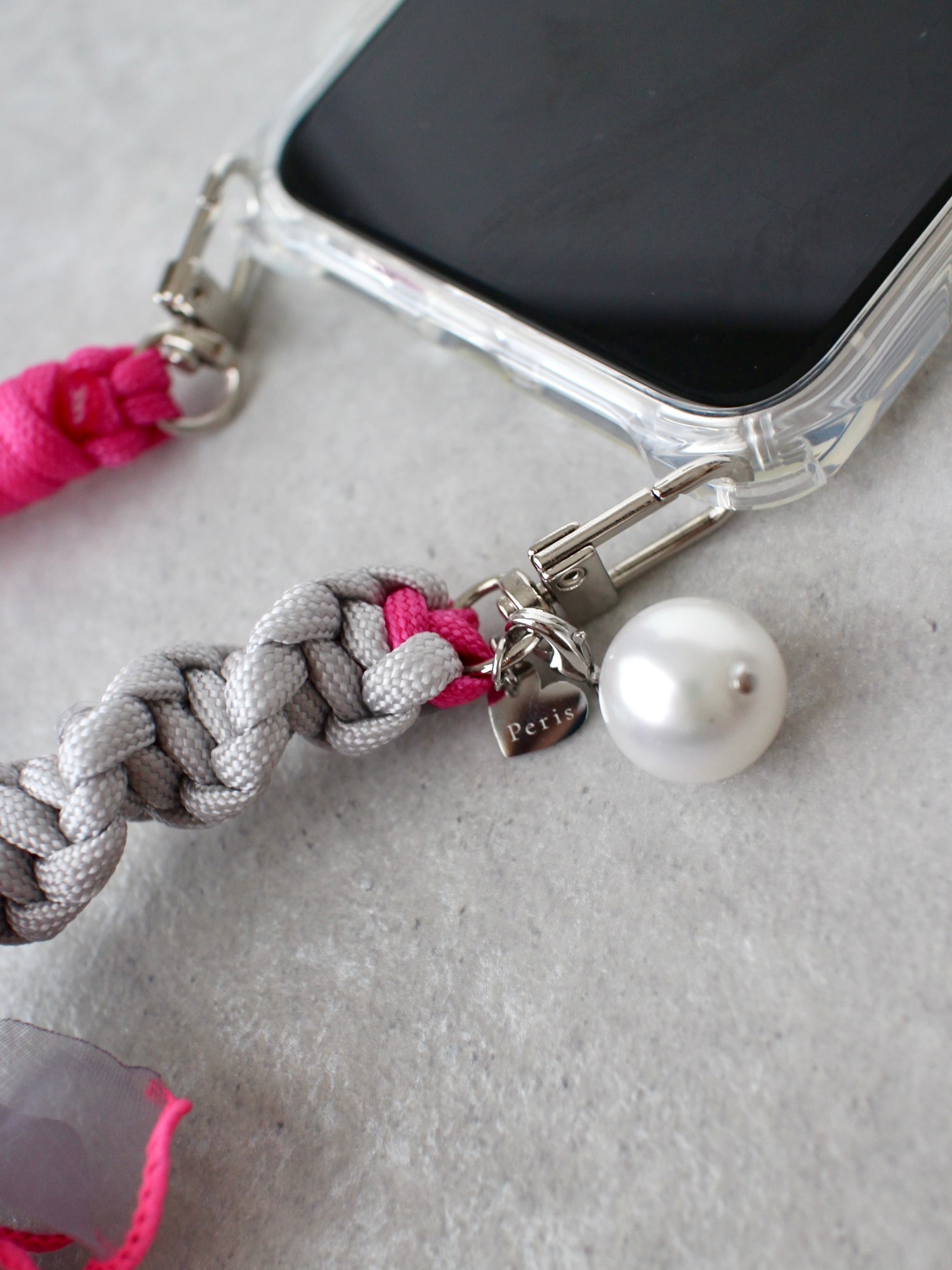 Perisオリジナルのハートプレートと、取り外し可能なパールチャームが付きます♡