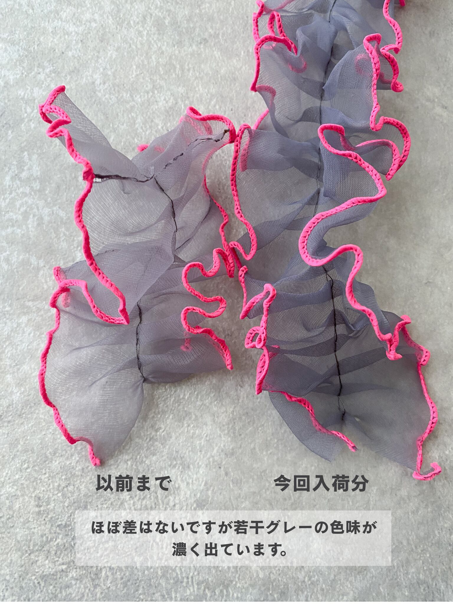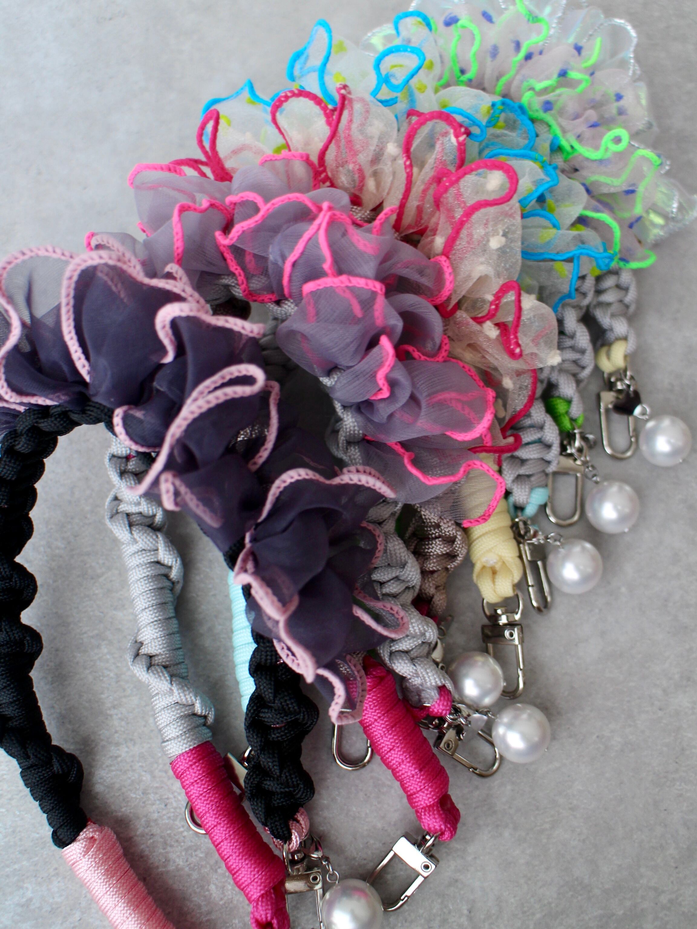 2色のフリルが目を引くデザインで、手に持ったり、バッグに引っ掛けたり、