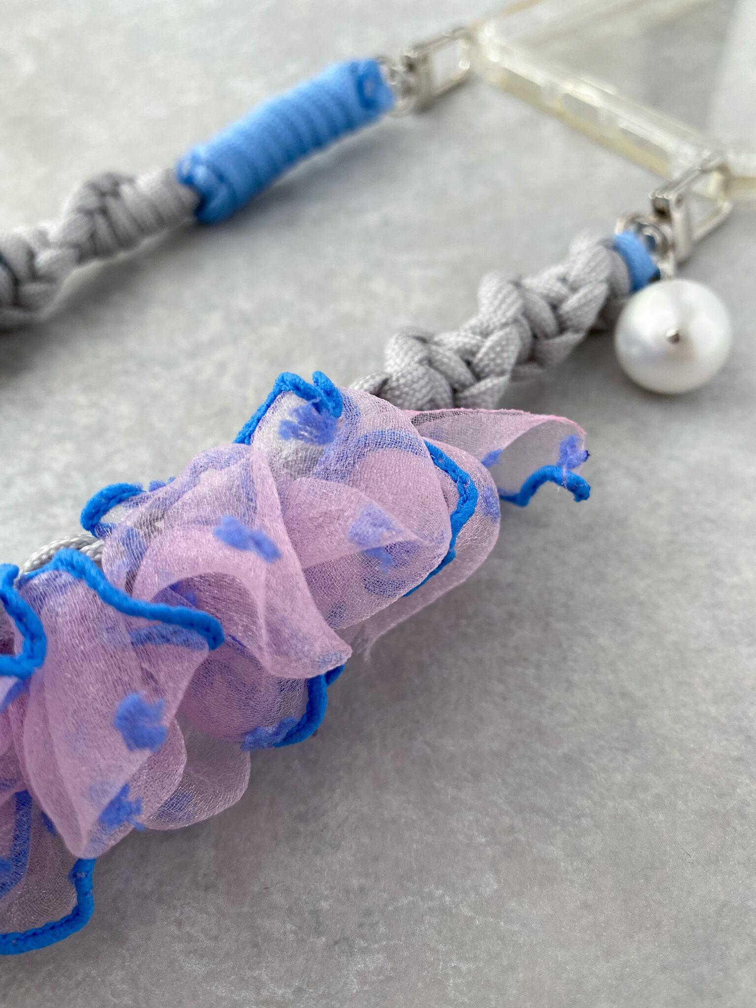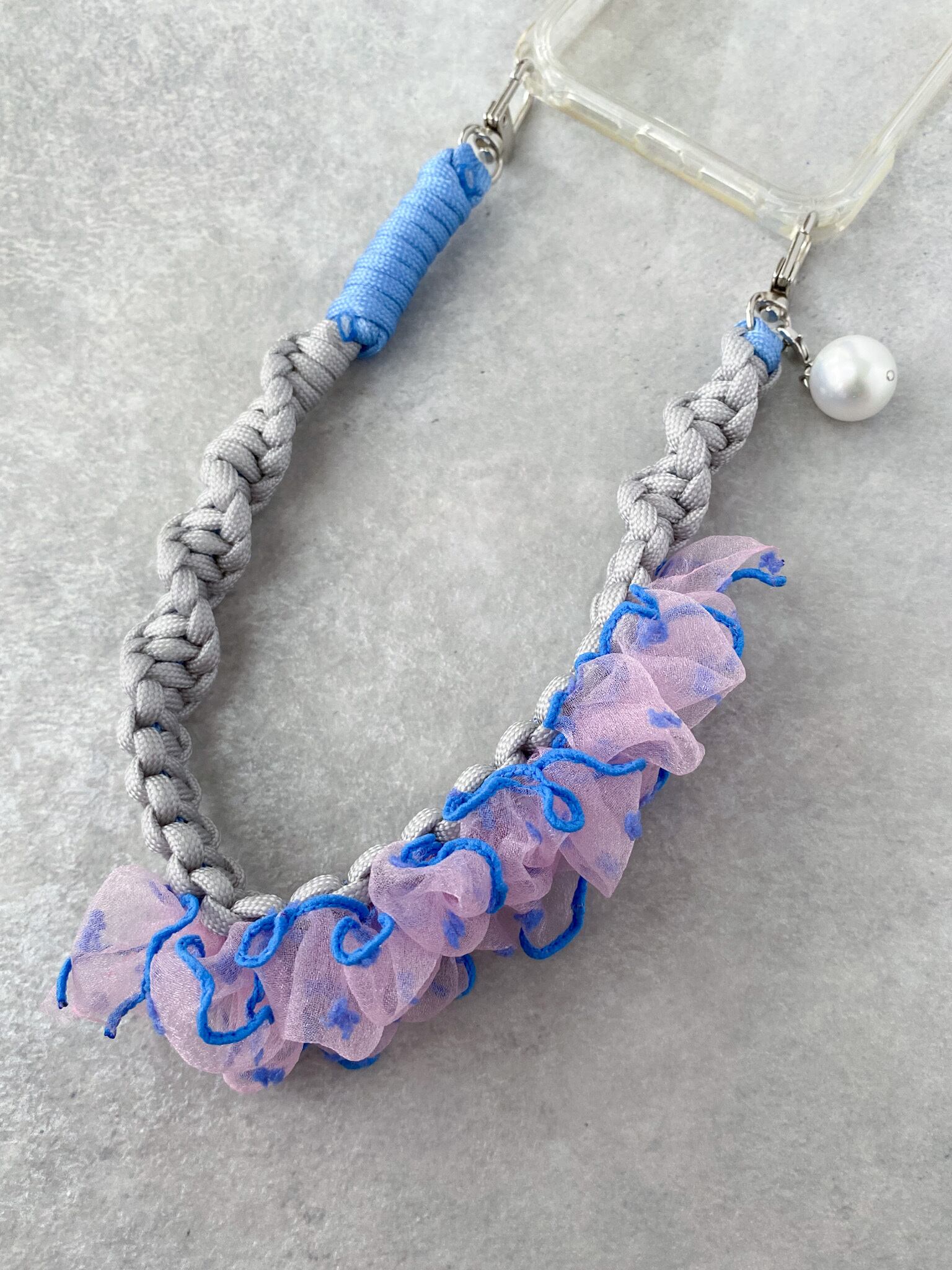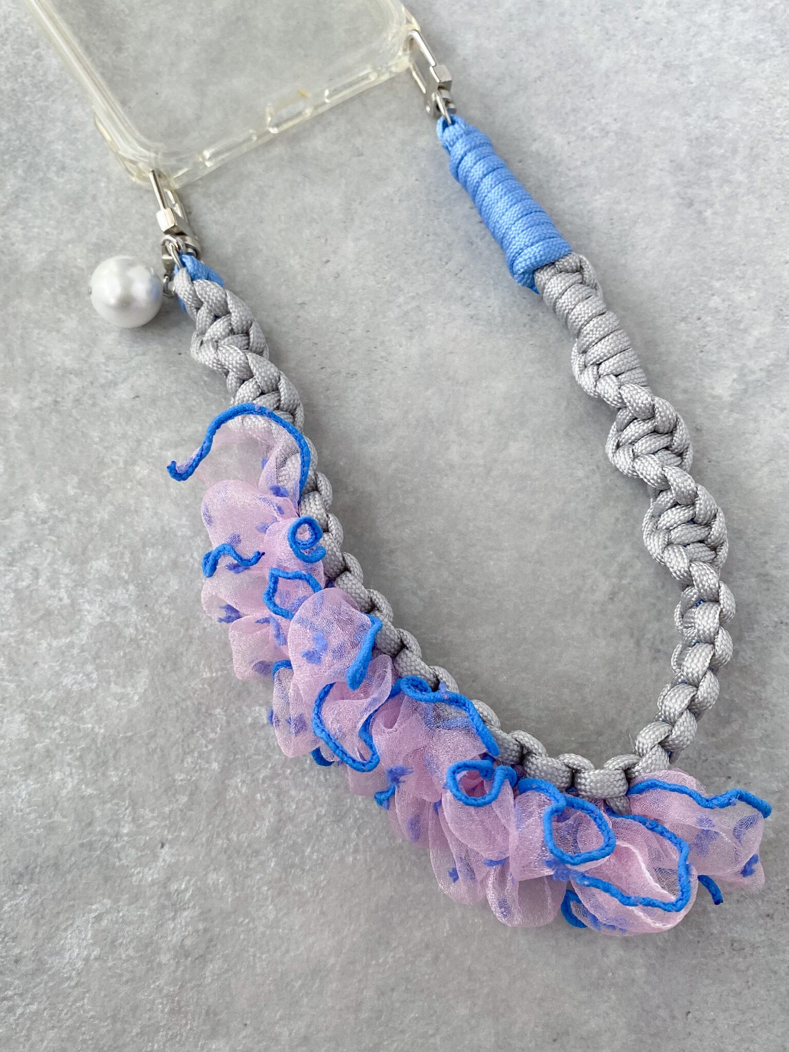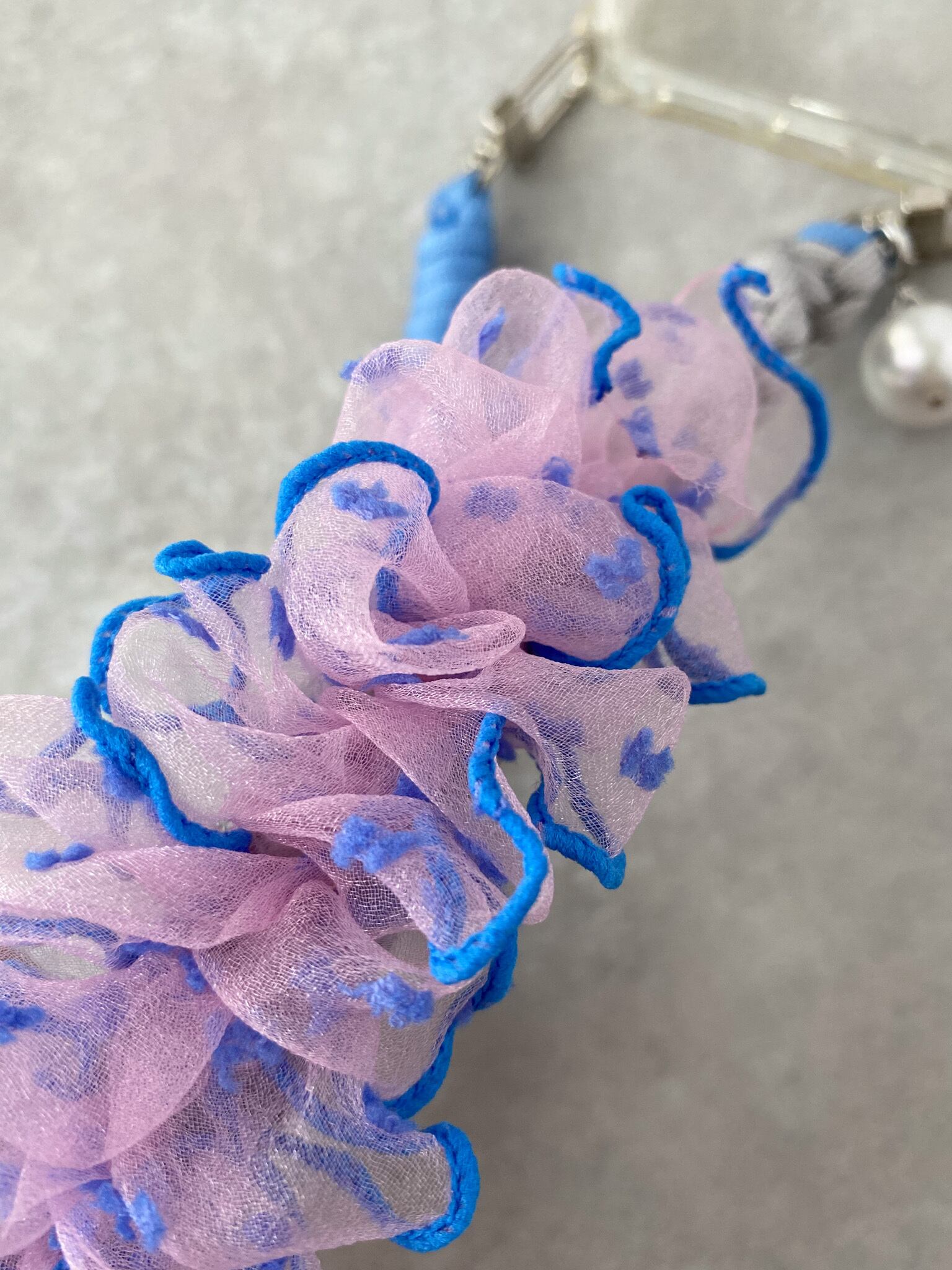 2色のフリルが目を惹くデザインで、手に持ったり、バッグに引っ掛けたり、