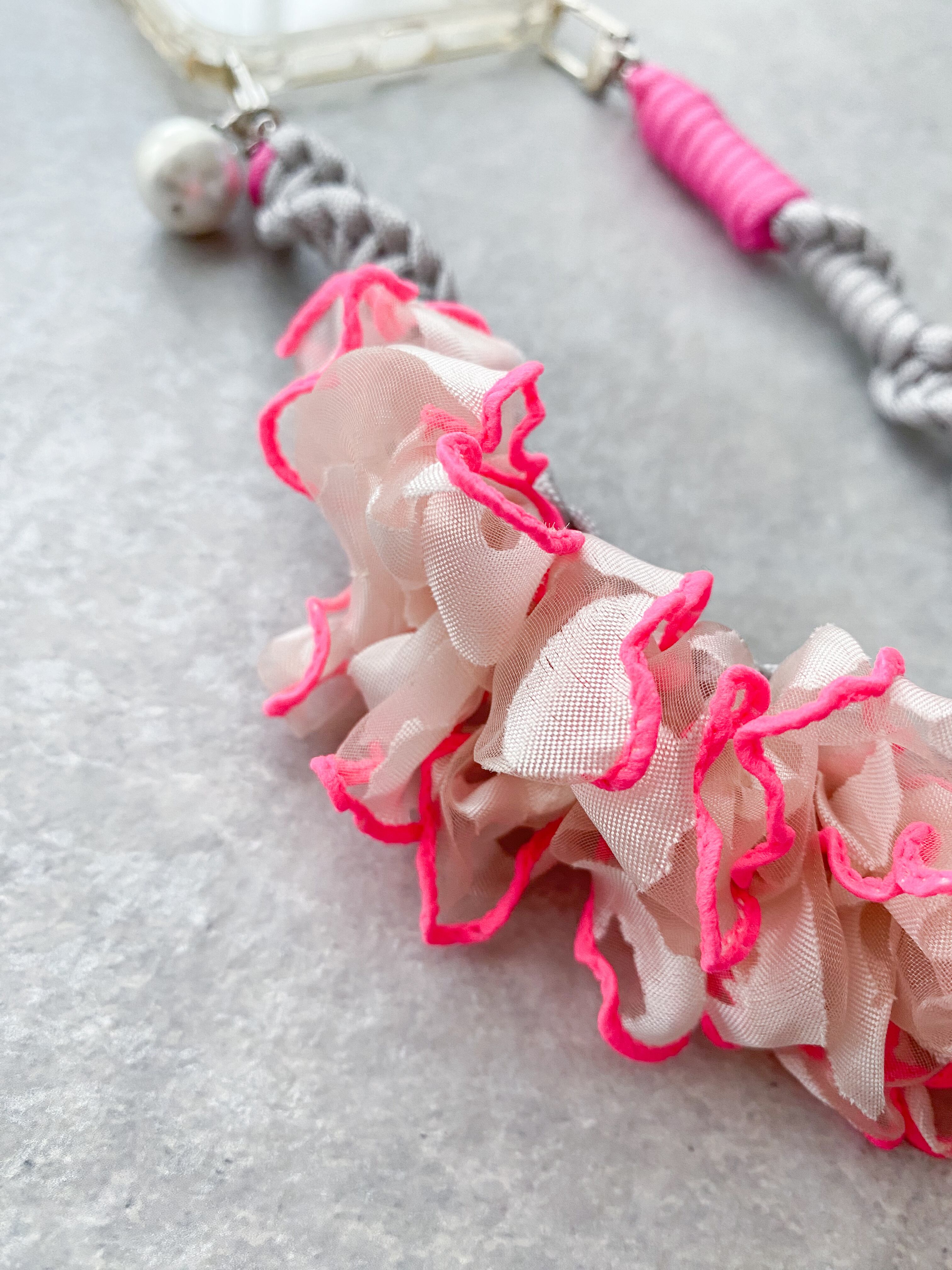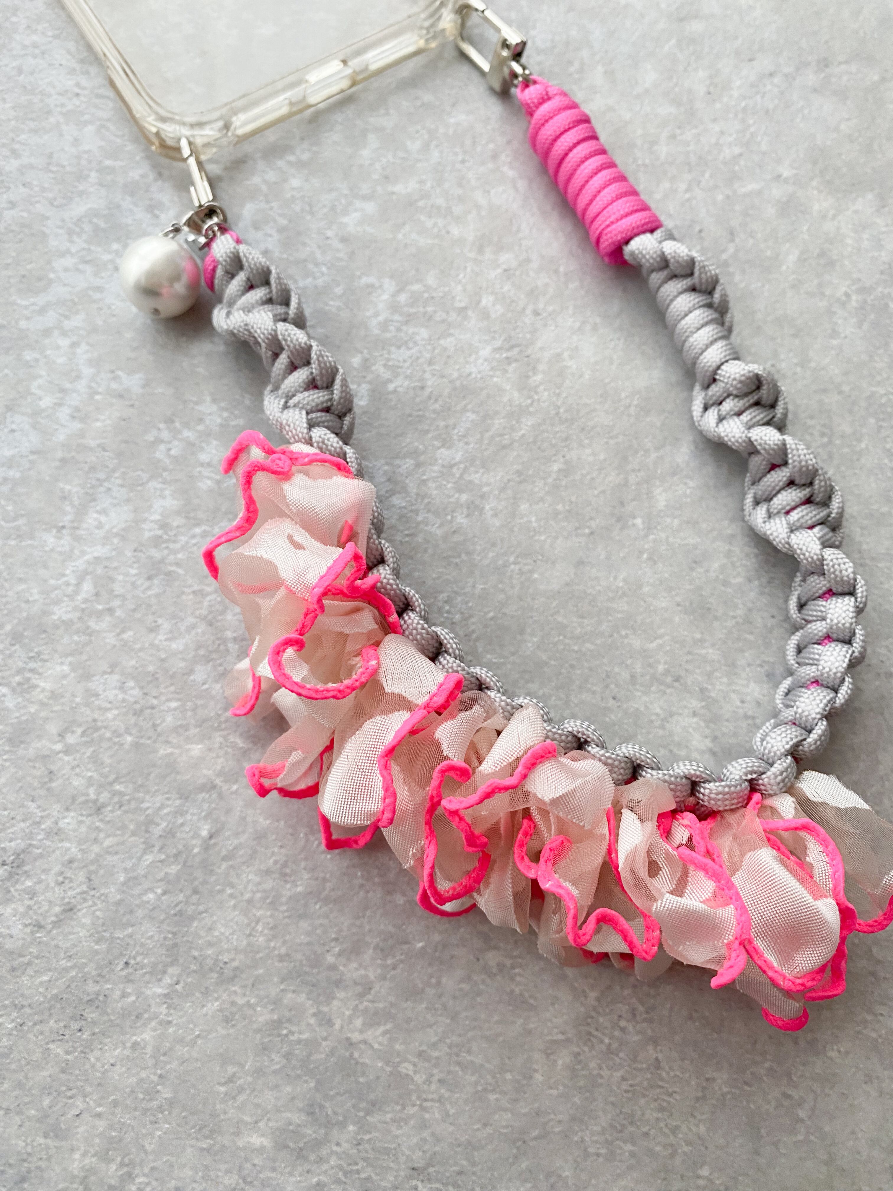 2色のフリルが目を引くデザインで、手に持ったり、バッグに引っ掛けたり、