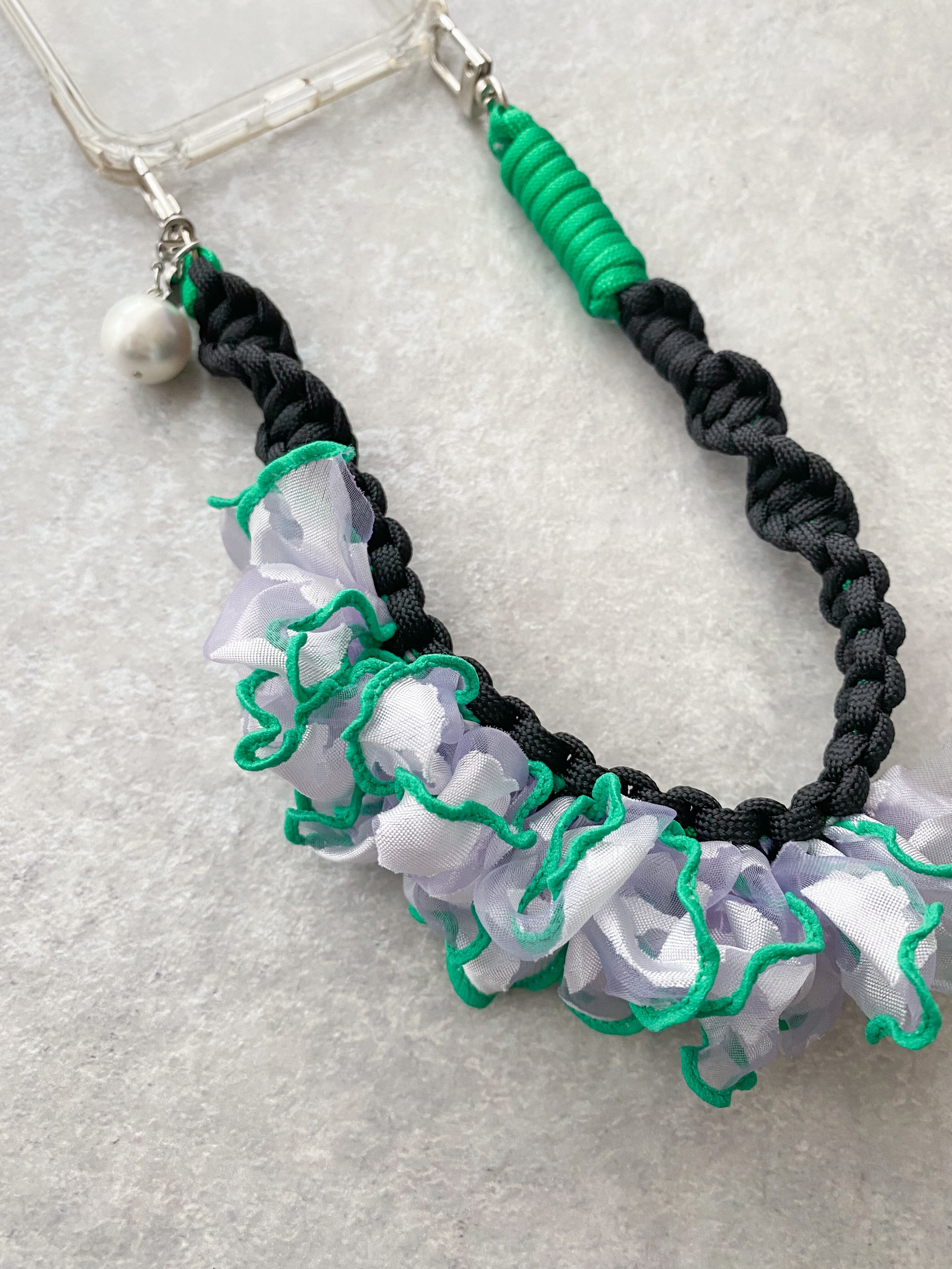2色のフリルが目を引くデザインで、手に持ったり、バッグに引っ掛けたり、