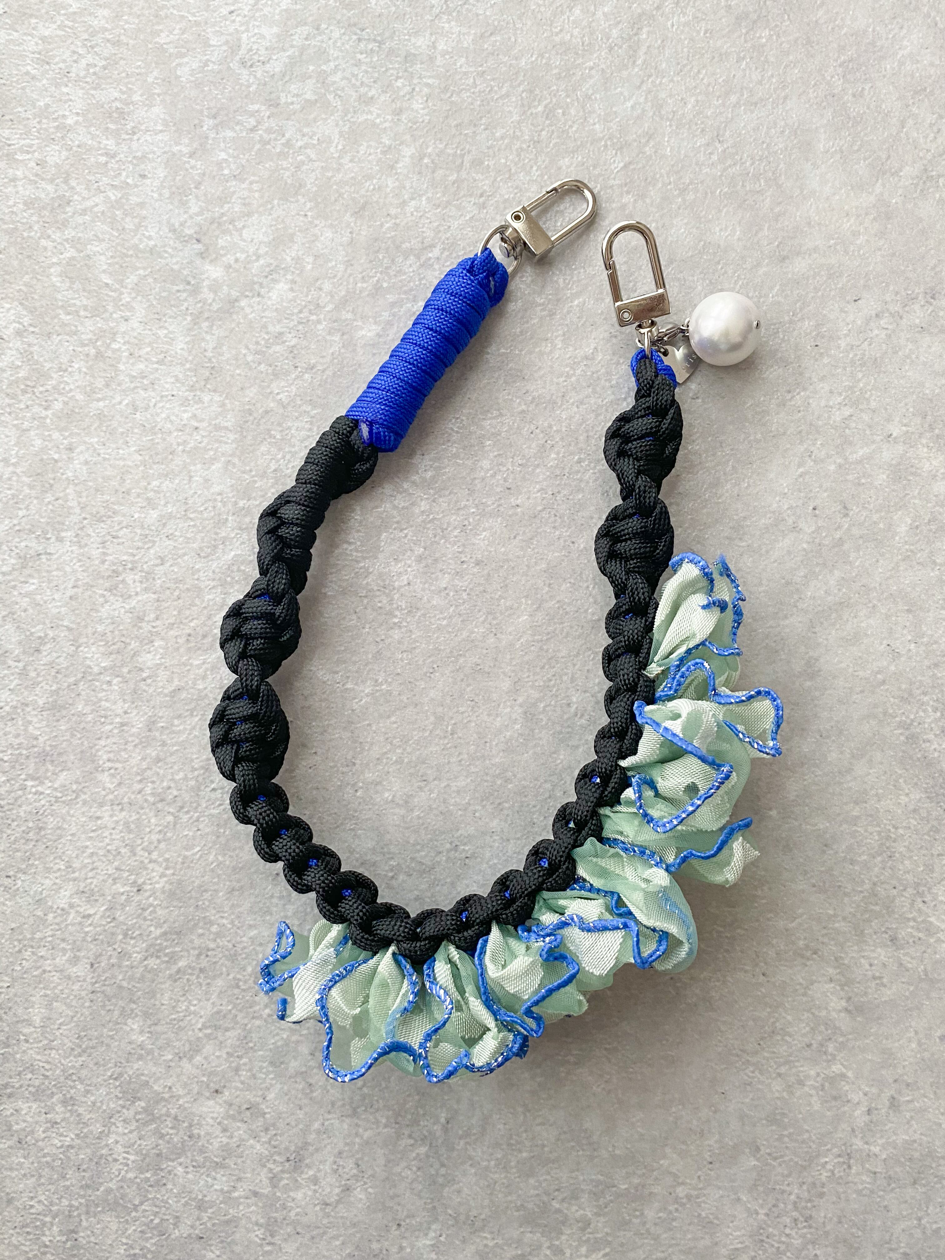 2色のフリルが目を引くデザインで、手に持ったり、バッグに引っ掛けたり、
