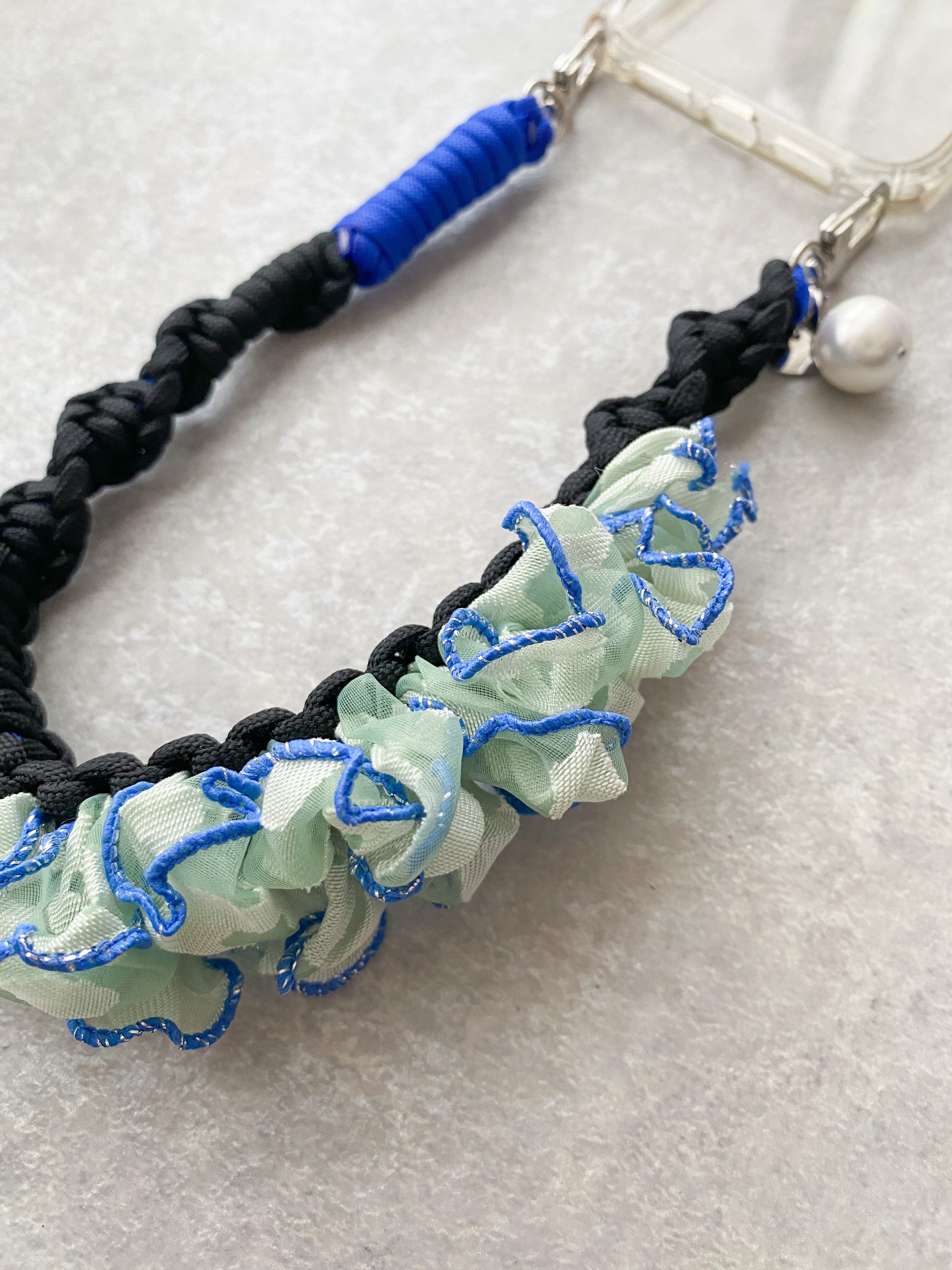 淡いグリーンと縁はくすんだブルーとラメも入っている贅沢なフリル。