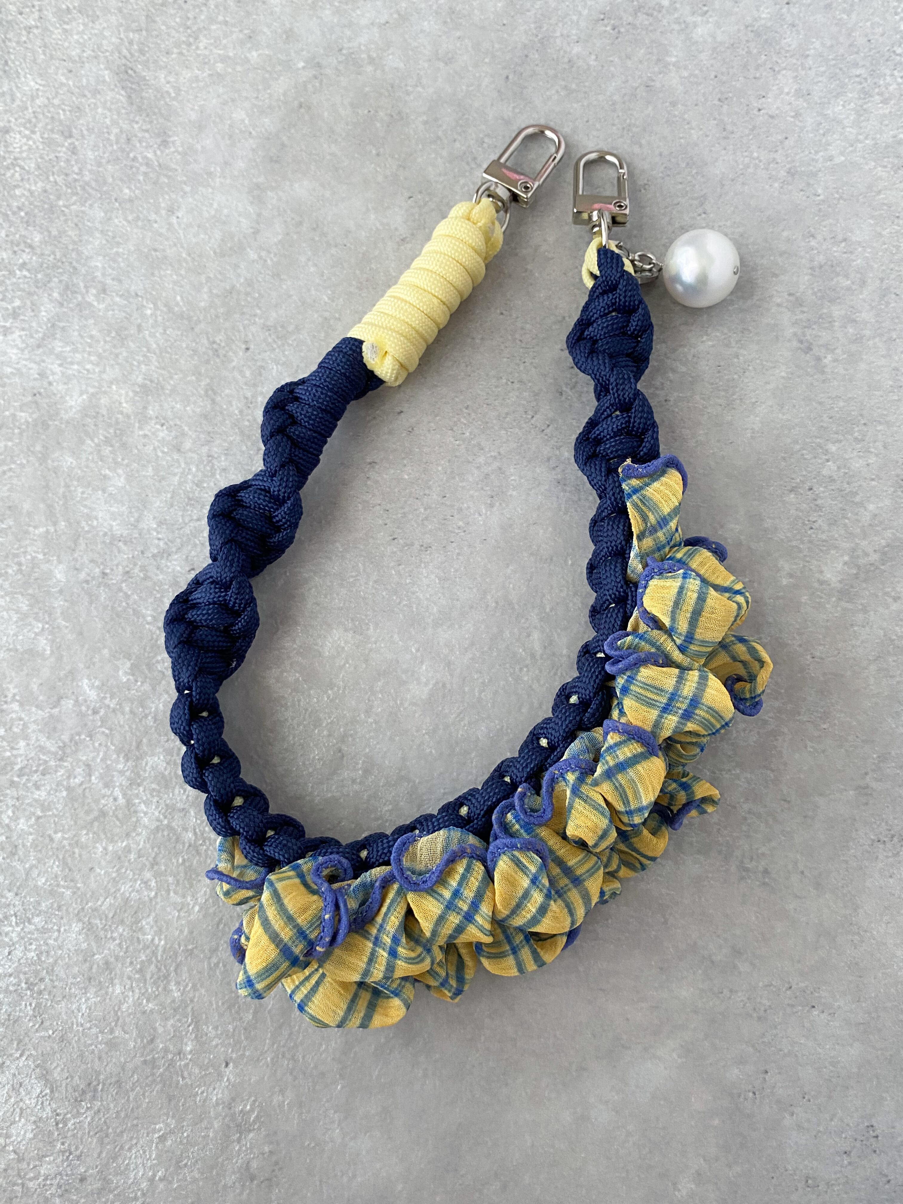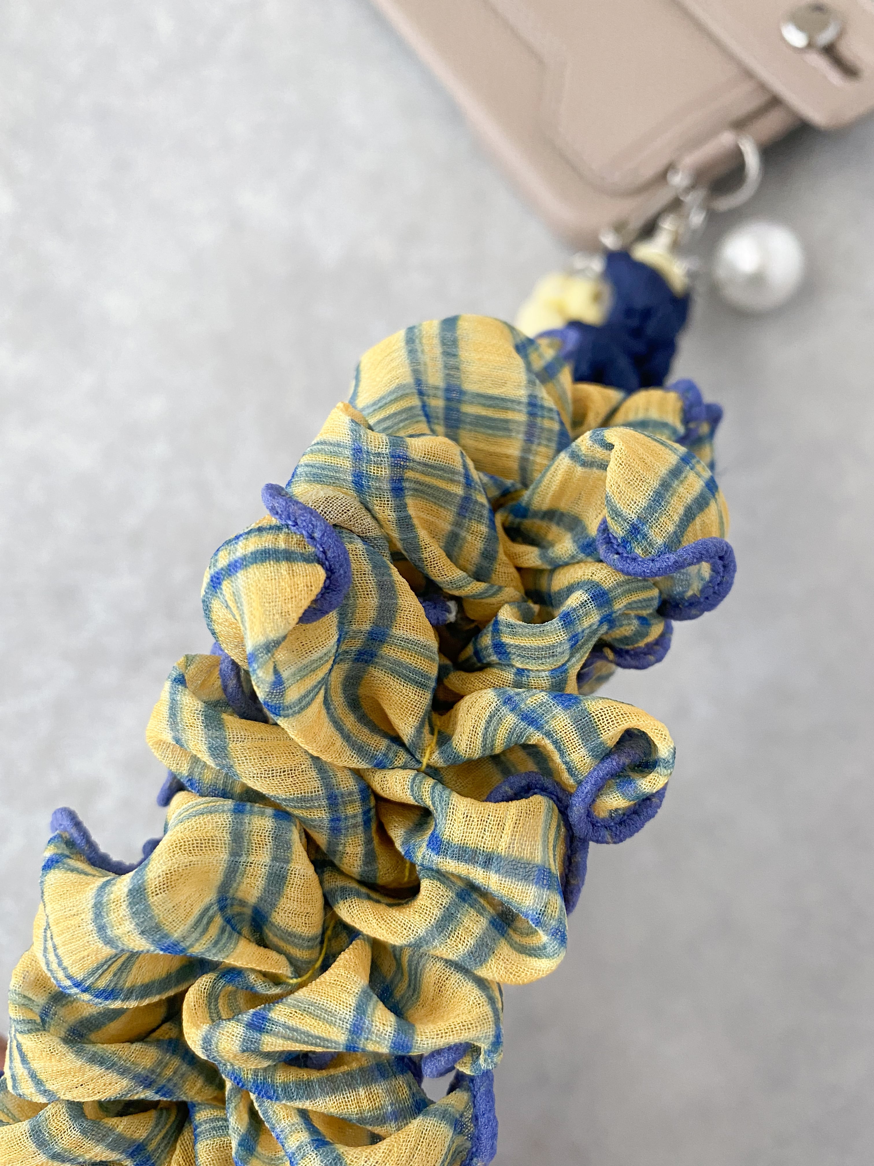 2色のフリルが目を引くデザインで、手に持ったり、バッグに引っ掛けたり、