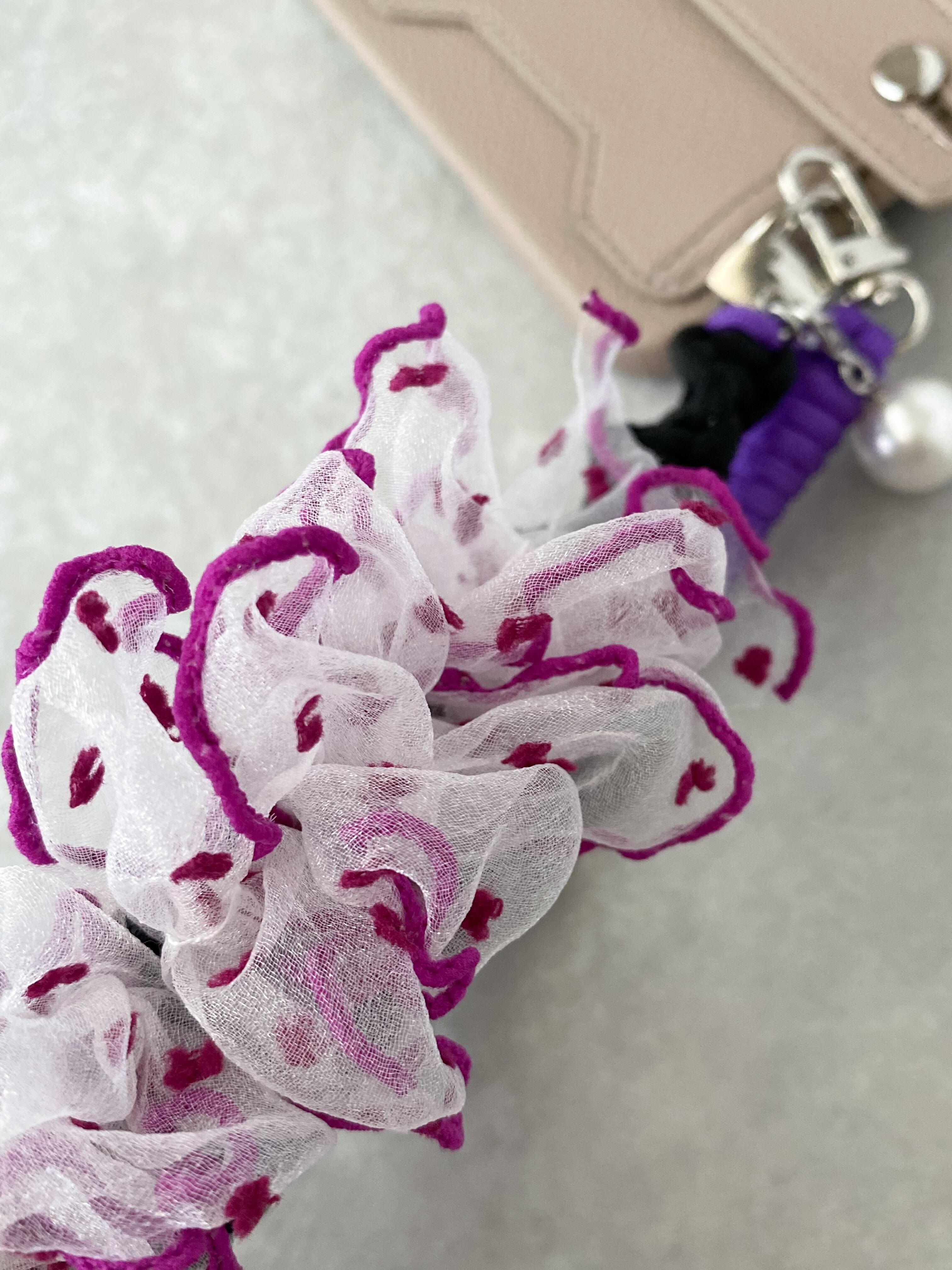 2色のフリルが目を引くデザインで、手に持ったり、バッグに引っ掛けたり、