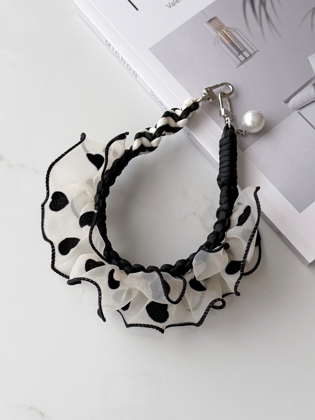 2色のフリルが目を引くデザインで、手に持ったり、バッグに引っ掛けたり、